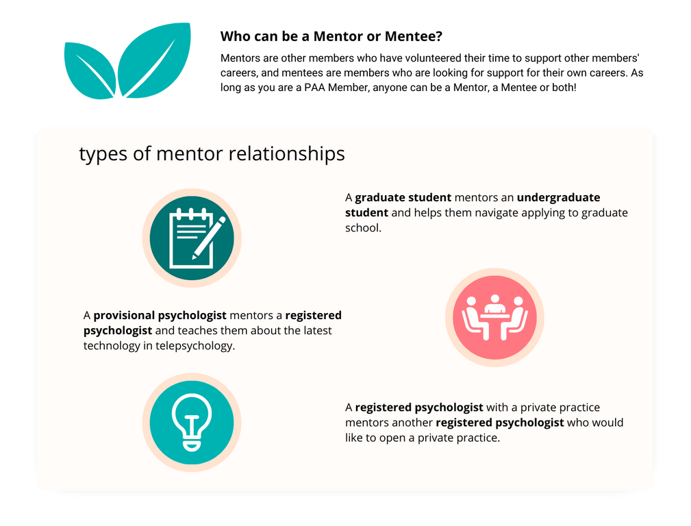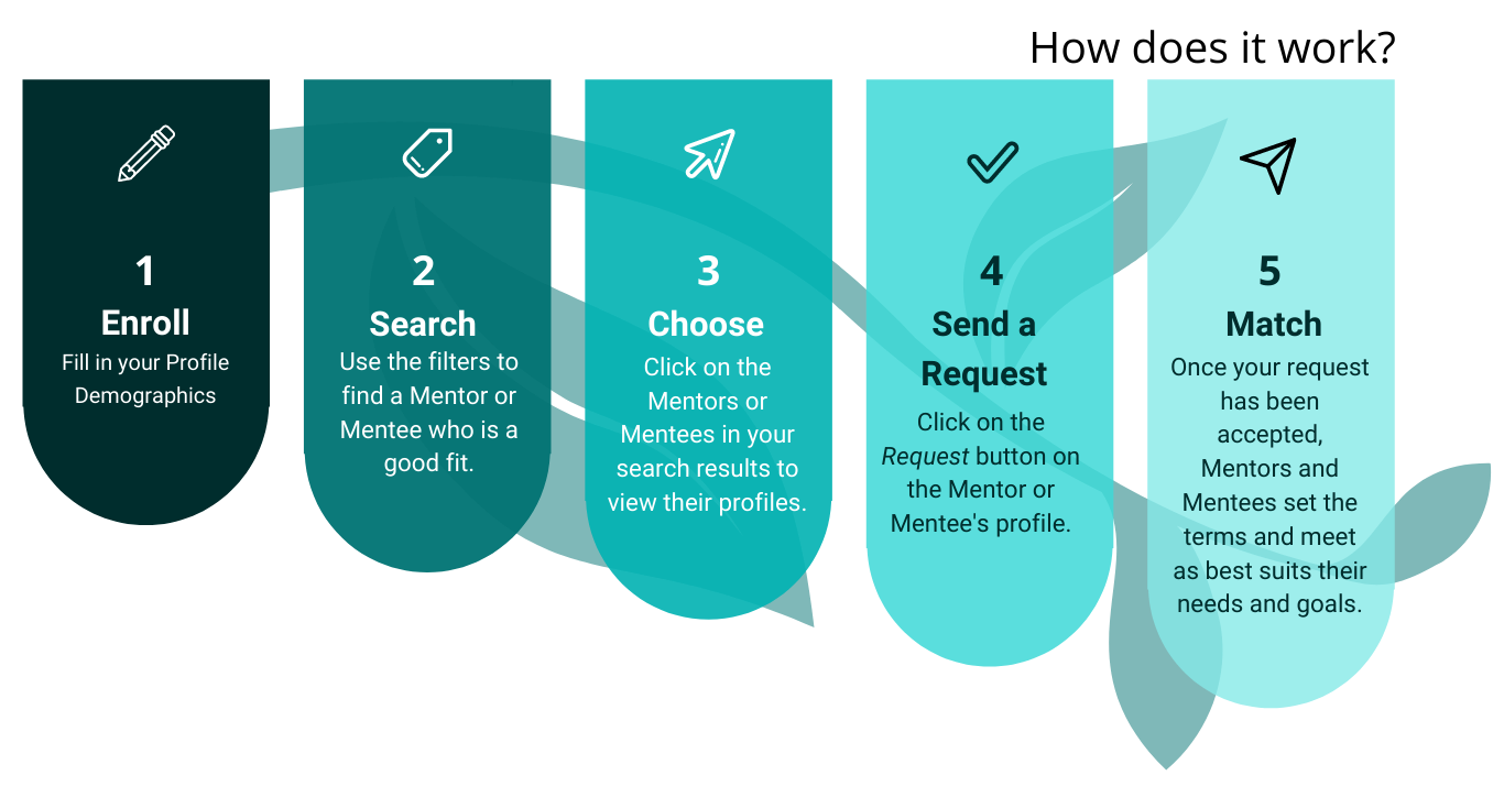 The Mentor Match program is an online tool prospective mentors and mentees can use to find one another. Members first enroll as a Mentor or Mentee (or both!), filling out their profile demographics. Be as detailed as possible - this will help suitable Matches find you! Once you've built your profile, you can search for Mentors or Mentees by filtering for these demographics.